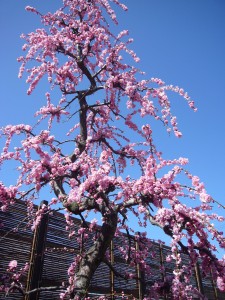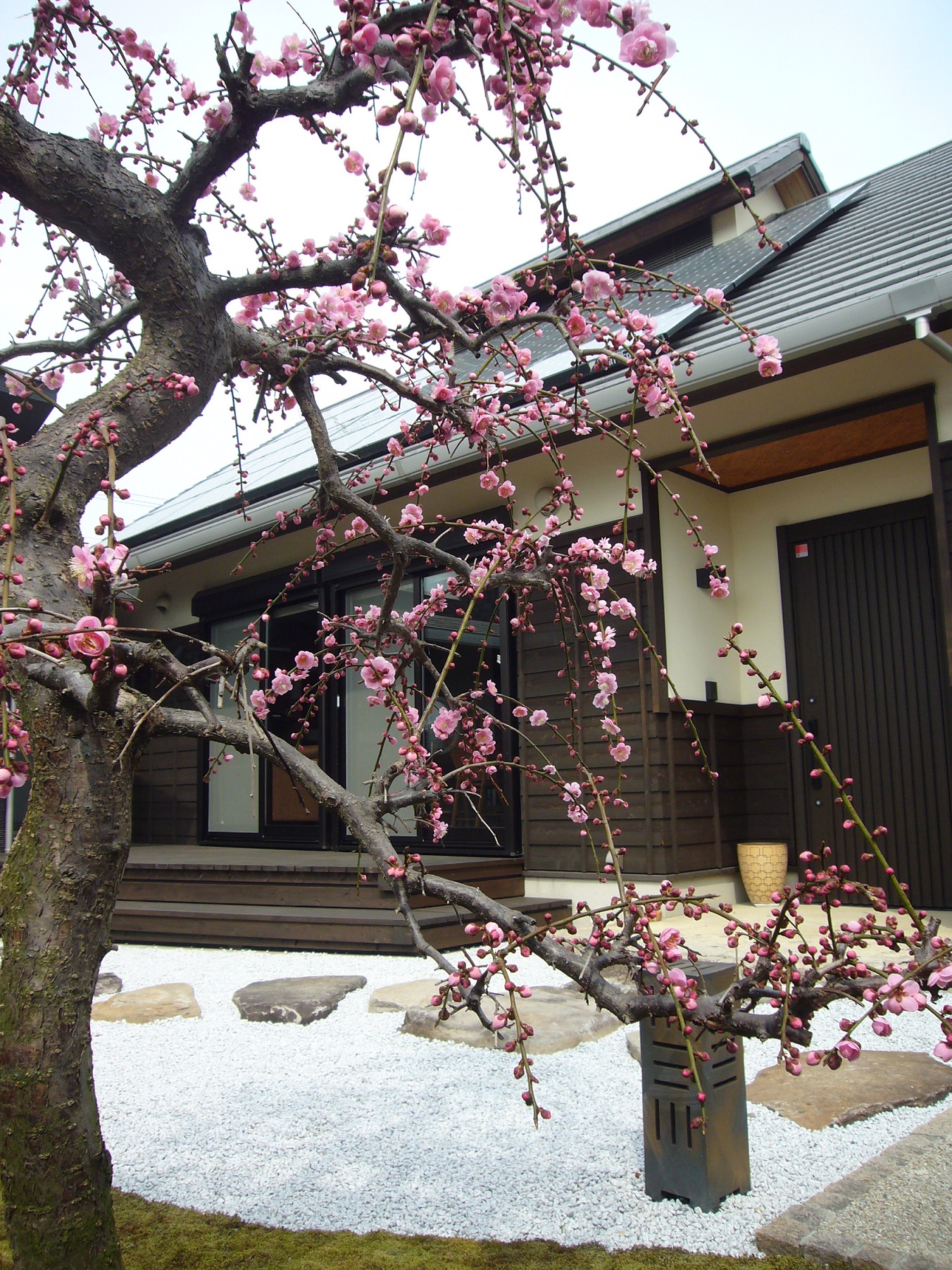お庭は苔と石と一本のしだれ梅。