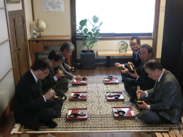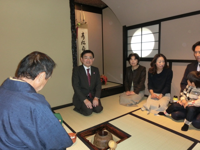 先ずトルコ絨毯に着座してもらい、そこでおぜんざいを差し上げ、それから席入りの案内をして、茶室で濃茶を練りふるまった。