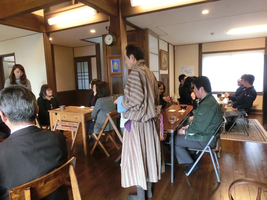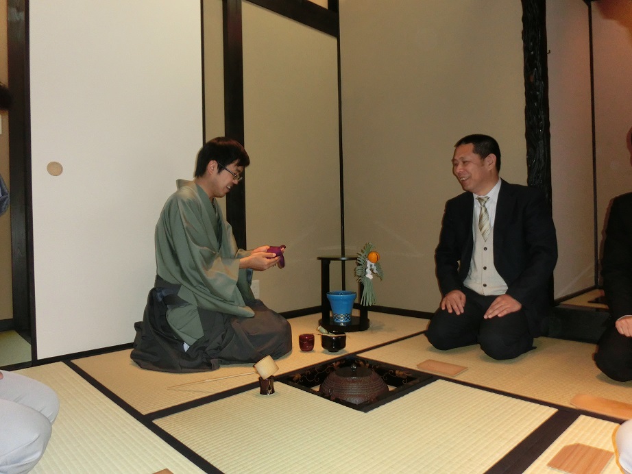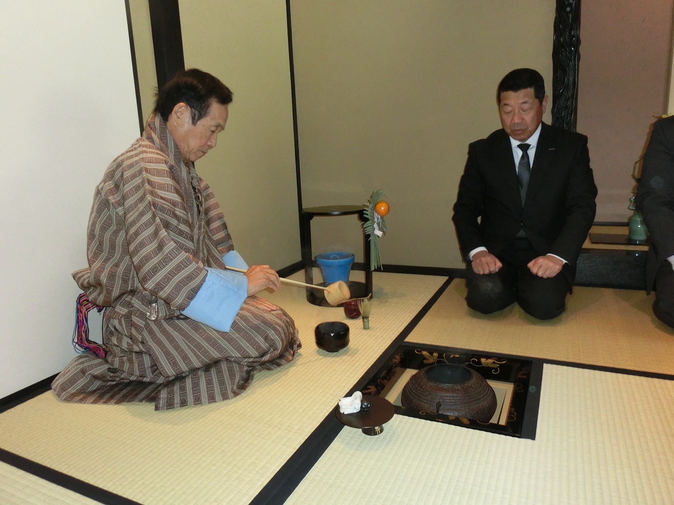 私は2年ぶりにブータンの民族衣装を着用して初釜に臨んだ。釜と炉縁は昨年或る人を通じて買い求めた物を使用した。初めて披露したものだったが、なかなか趣のあるいいお道具である。最初の1席のみ私がお点前をして幹部社員達にふるまった。