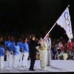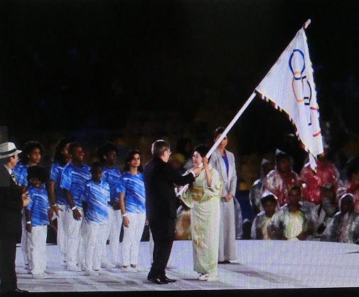 リオバエス市長から小池東京都知事に五輪旗が手渡された。4年後に東京でオリンピックは開催される。