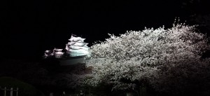 ライトアップされた白鷺城を背景に、千姫ぼたん園を横目で見ながらの、まことに風流そのもののお花見である。