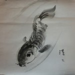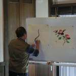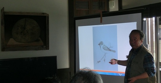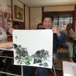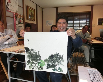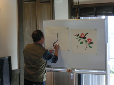 途中実演も交えて我々に芸術の楽しさを体感させていただいた。例えば、和紙に塾生にアトランダムに落書きをさせ、それを素早くデッサンも下絵もなしに見事に絵画作品に仕立ててゆく。