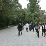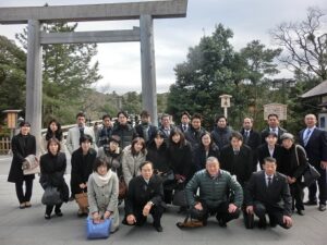芳名帳に住所と志澤塾香山廣紀と記し、我々は神官の厳かな案内のもと、ここからは天皇家しか入れない鳥居の前で御垣内参拝をさせていただく。~二禮二拍手一禮~全員の御垣内参拝が正宮内に響き渡る。身も心も洗われその余韻に浸りながら神楽殿においてお祓いを受けたのち、引き続き古式豊かに奏でられる雅楽の中、6人の巫女による優美な舞を堪能する。控室に移動し直会を頂く。私は天照大神のお軸を買い求めた。一連の儀式を終え、おかげ横丁へと足を運び約一時間の自由時間を楽しんだ。