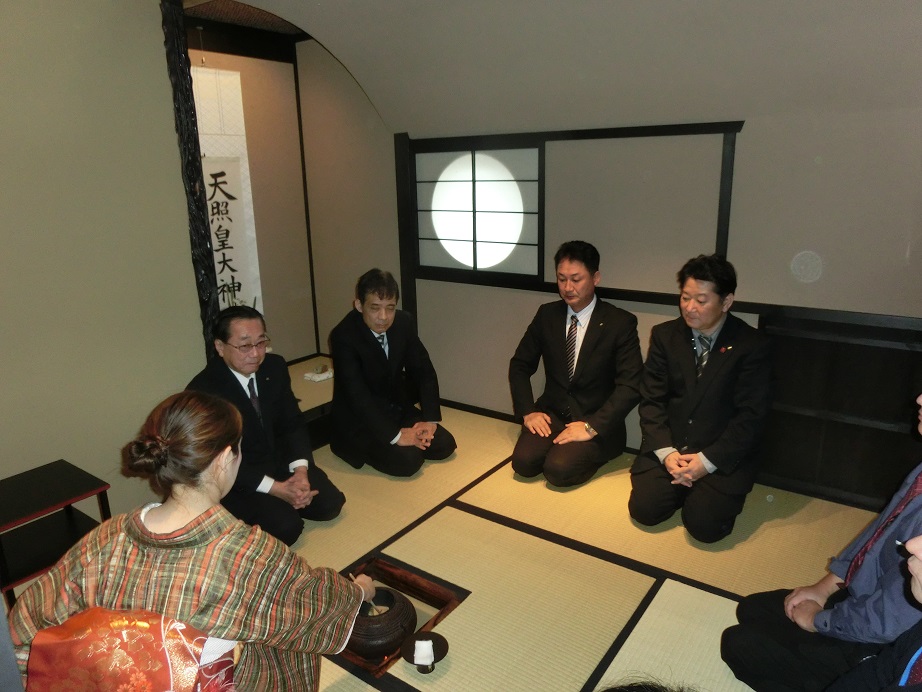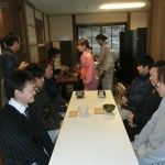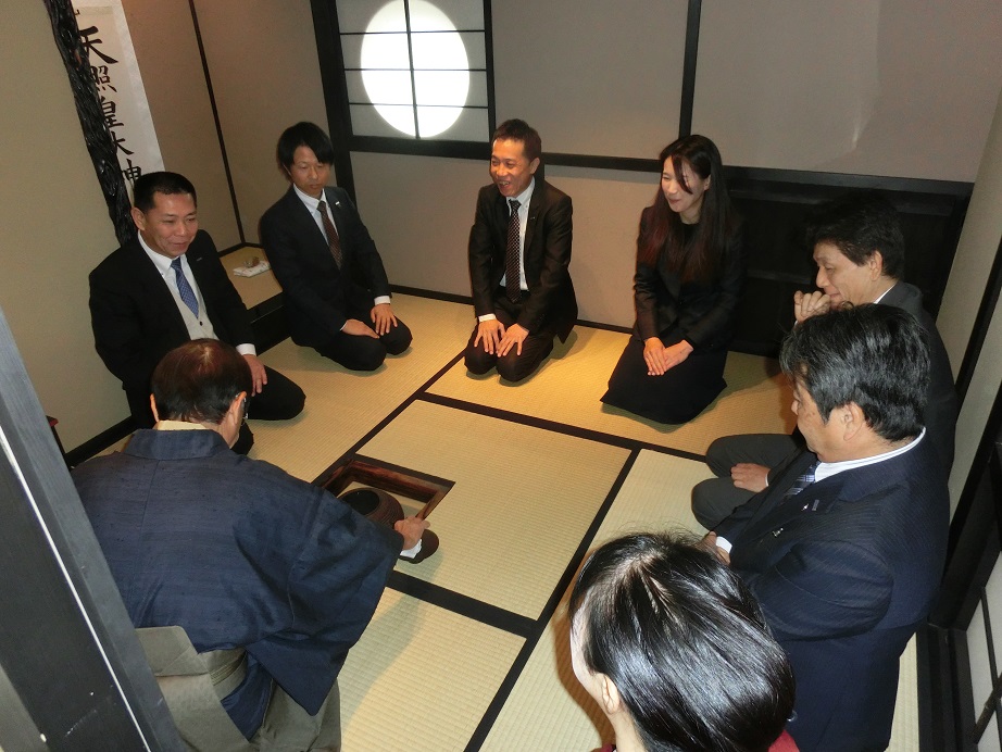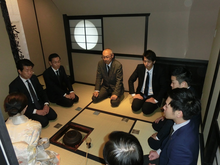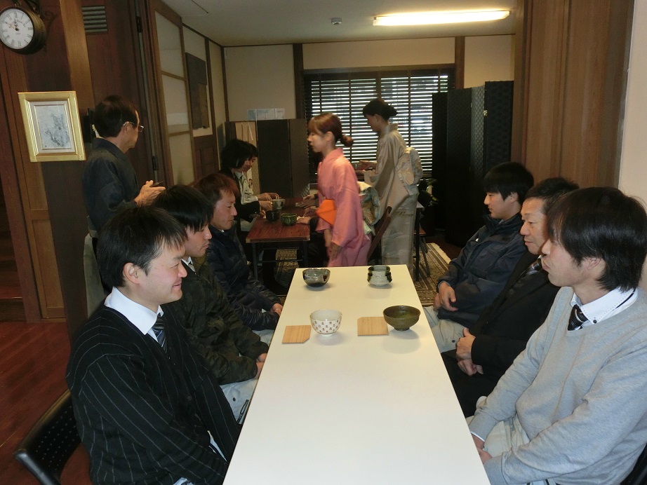 私は最初にお点前をし、1回後見についた後は志澤塾内に設置したテーブルでお茶を頂いている社員に「花びら餅」のいわれ・お茶の頂き方・腕時計や装身具は身から取り外すことなどなどを平易に話する。何かの縁でお茶会に出席することがあったときに慌てずお茶を頂けるようにと思っている。