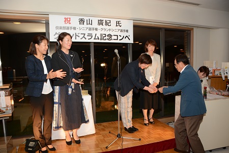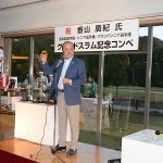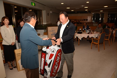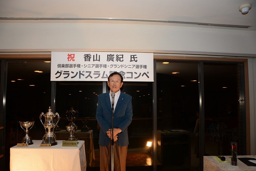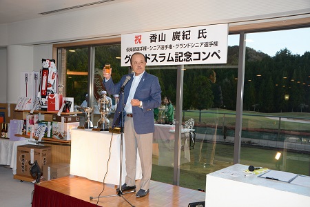 その日は微風好天の中、ゴルフ日和に恵まれた。ジョイックスゴルフクラブにおいて、クラブ選手権・シニア選手権・グランドシニア選手権制覇の記念ゴルフコンペ、ならびに祝賀会を開催した。クラブ選手権は2001年に、シニア選手権は2011年及び2012年に、そして今年グランドシニア選手権に勝利し、グランドスラムを達成することが出来たのを機に祝賀会を催した。総勢206人の皆様に参加していただき、多少の混渋はあったものの和やかなうちに無事終えることが出来た。行き届かない点もあったと思うが、文句も言わずに最後まで盛り上げて頂いた。古市忠夫プロによる始球式・岡田彰布氏による乾杯。全てに感謝しかない。これからもゴルフを益々楽しんで行こうと思った。
