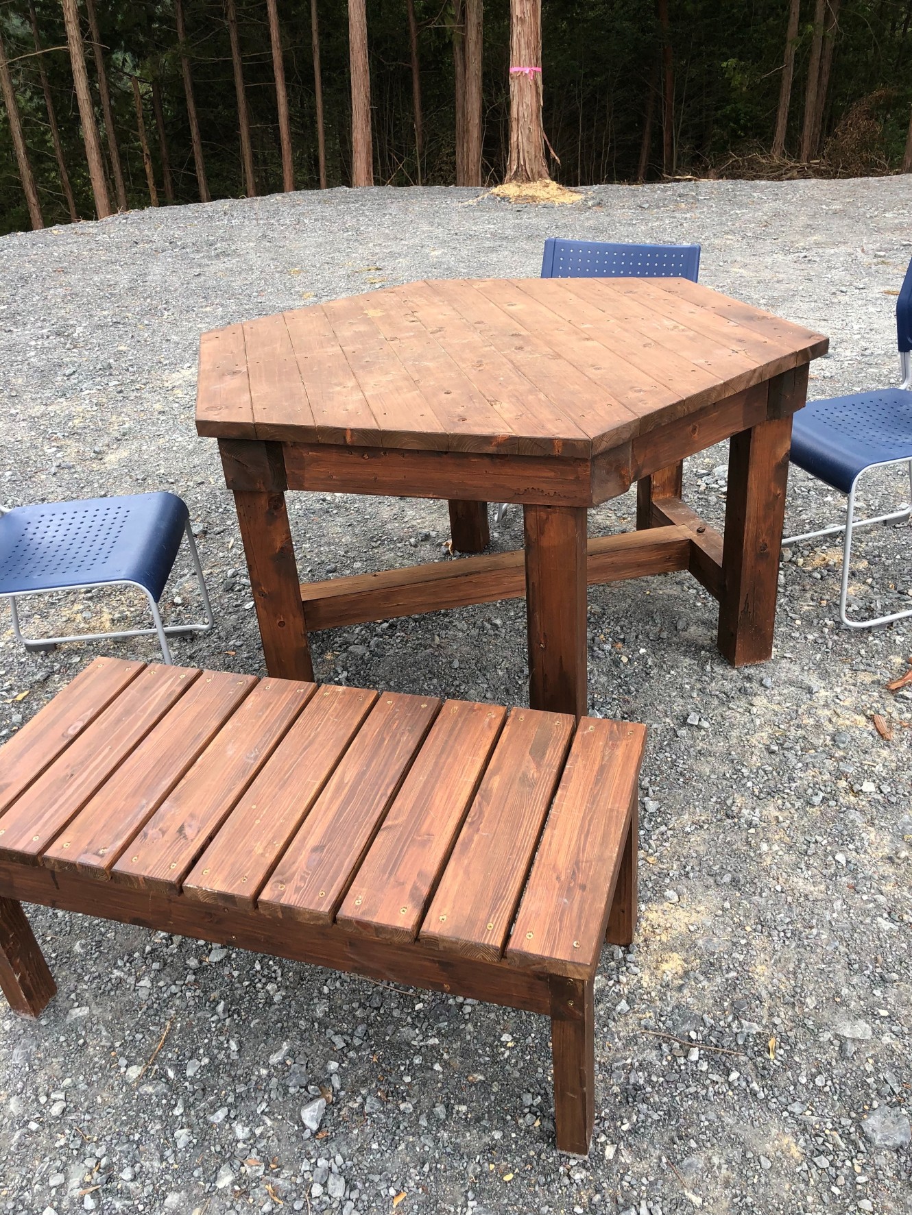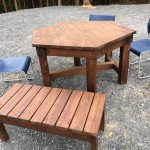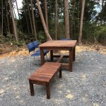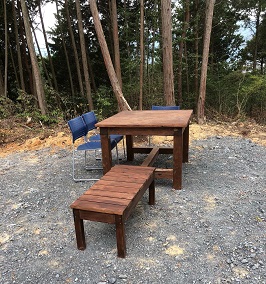 何とかならないものかと思い、のプレカット工場で作業工程上様々な端材が排出されているのを思い出した。すぐさま出かけて工場長に相談したところ「何とかします」と心強い答えが返ってきた。1週間ほど経過したころトラックにテーブル二つとベンチ三脚を乗せ、私の自宅まで運んで来た。自治会長をしている私の同級生に連絡し見に来てもらったところ、彼はたいそう気に入り次の日、村の役員3人ほどに声をかけ軽トラで頂上まで運んだ。それから何日か経ったある日、家内と二人で弁当を持参し登ることにした。登ってみるとそれらは何一違和感もなく辺りに溶け込こんでいた。《これは基地になりうる》とほくそ笑んだ。