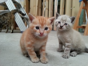 物流部門に勤務する社員に、猫ちゃんの飼育の仕方や主な習慣を教えて、倉庫の中で飼うことにしたのである。私が、親猫は6月に知り合ったので《ジュン》子猫は《タロウ》と《アン》と命名した。餌や猫砂はもちろん、避妊手術や定期検査に至るまで、私の家内がすべて取り計らっている。放し飼いにしていたのであるが、時々夜になっても帰ってこなかったりして、心配させるので今は二階の一室を開放してそこに住んでいる。社員はもちろん出入り業者にもたいそう可愛がられ、のんびりと暮らしている。