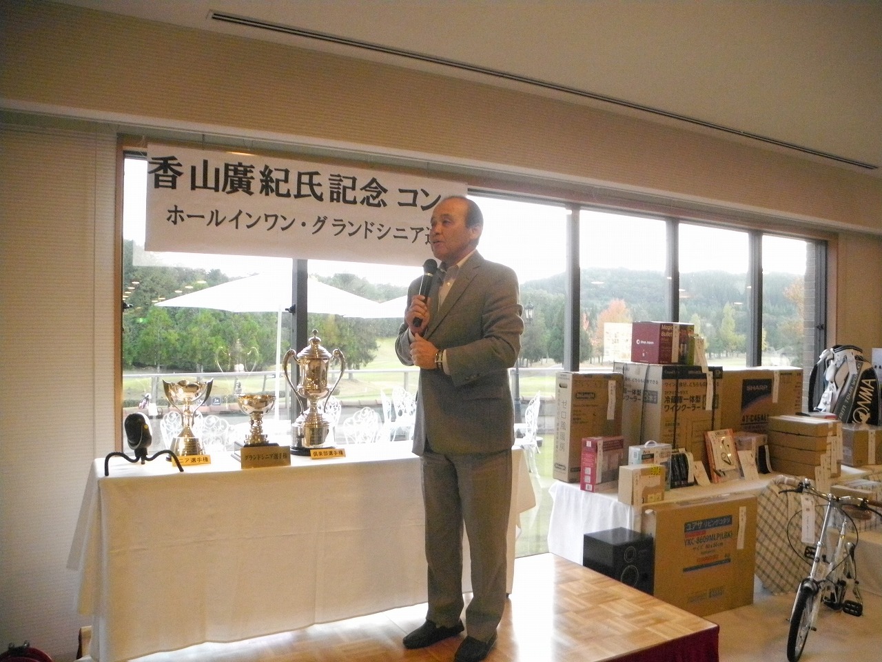 表彰式も出来るだけ短時間で執り行うように配慮したつもりだった。先ず高橋氏に開会の言葉を頂き、次いで今年も多忙の中駆けつけて頂いた、阪神タイガース元監督の岡田彰布氏に祝辞を頂戴し、乾杯は死闘を繰り広げた決勝戦の相手で、ホールインワンの見届け者でもある森崎氏にお願いをした。