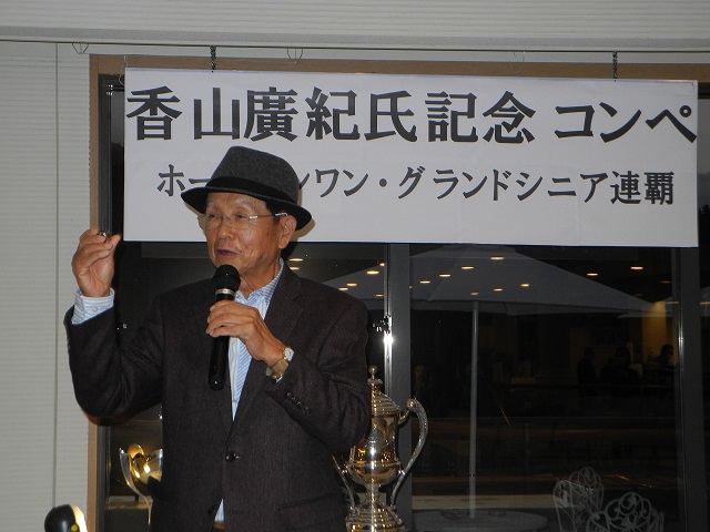 最後に私が謝辞を述べた。当ジョイックスゴルフ倶楽部4人の美魔女(ゆうこりん・ゆきねえ・ひかるちゃん・さゆりおねえさん)から記念に頂いたボーラーハットを被って、森崎氏からお祝いに貰った薩摩切子のボールマークも紹介しながら、香山流に感謝の心を伝えた。