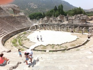 昼食後エフェソス遺跡を見学。昨年訪れたポンペイほどではないが、規模と保存状態の良さは、それに匹敵するものが感じられる。2万4千人を収容できる大劇場は、ローマのコロッセオを彷彿させるものがある。また公衆トイレや娼館も残っており、生涯の大半を視察に費やしたハドリアヌスの神殿、コンスタンチヌスゆかりの住まいも見受けられ、一年ぶりに古代ローマに触れたひと時だった。
