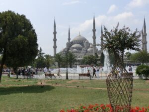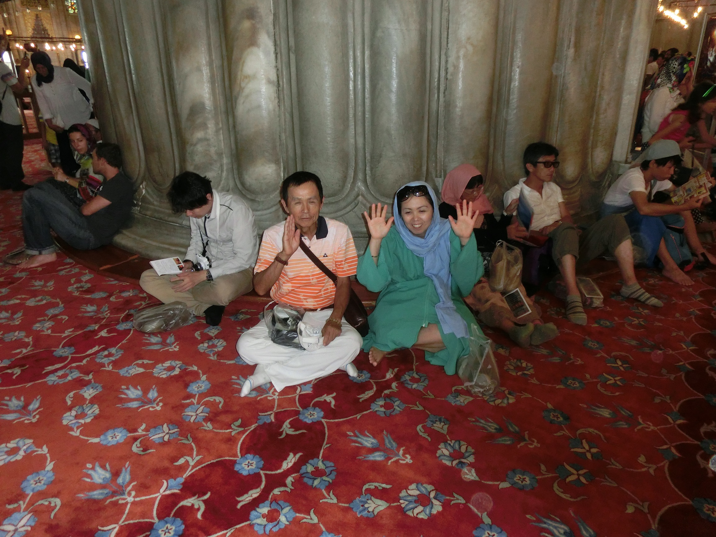 午後の1時近くになっていたので昼食を取ることにしたが、適当なお店が見当たらないのでホテルに帰りランチをすることにした。ランチを済ませてから、暑さと歩きに多少疲れたので、私の部屋で休憩をとる。昼寝を含めて1時間ほど身体を休めてから、スルタンアフメット・ジャーミィへ行った。この建物はオスマン朝時代の最高傑作で、トルコを代表するイスラム寺院であり、今も多くのイスラム教徒の礼拝堂として使用されている。