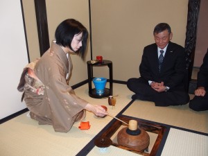 先ずトルコで購入してきた絨毯の上でぜんざいをふるまい、それから蹲の横を通って席入りをしていただいた。席入りの人数はだいたい六~七名。お茶室では炉開きに相応しく『濃茶』を点てた。初心者の私にとって、炉の濃茶はなかなか手強い点前である。三日前くらいから特訓を受け、どうにかこなした。今給黎女史(事務員)と、応援に来ていただいたS女史と三人で、代わる代わる点前と後見を繰り返しながら進めていった。