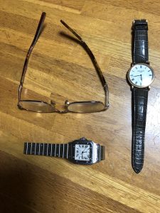 先ず、画像の銀色っぽい時計ですが、ベルトが少し緩くなったので、パーツ一つを取り除いてもらいました。今一つの時計は、黒のベルトから私が持参したグレーのベルトに交換して貰いました。メガネは、ずり落ちそうだったので、ねじを締めなおして修正していただきました。その間30分。