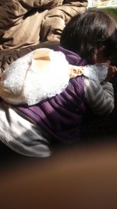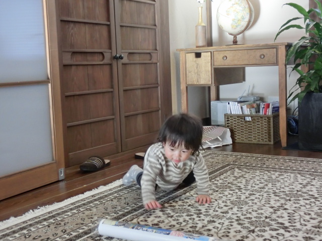 先日の炉開きに妻も義娘も参加できなかったので、茶室《波裡庵》に立ち寄り私のお点前で《濃茶》をふるまった。その間も彼はリビングを元気良く這い回っていた。