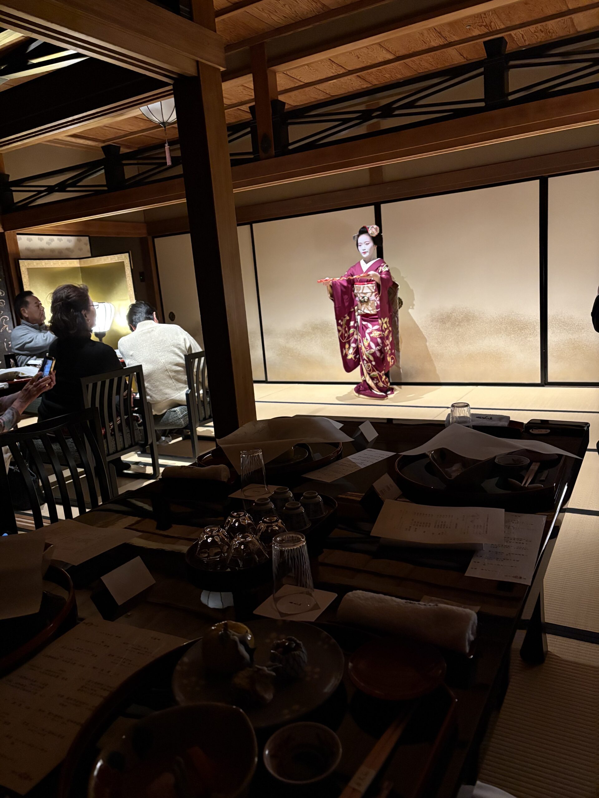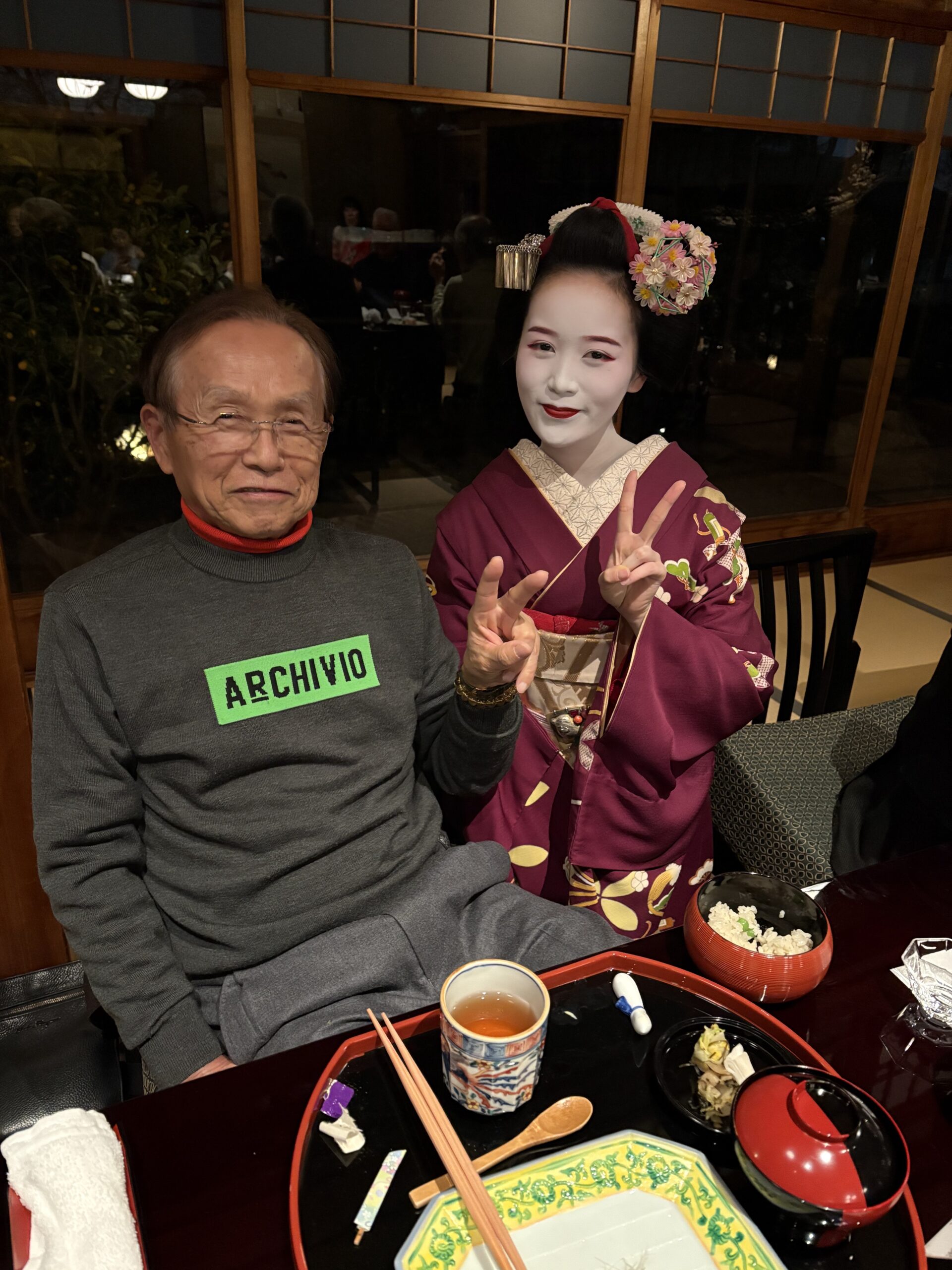 食事はどれもこれも超一流で、一日目の昼食は、近江牛による「肉のひろ重」のすき焼き、その夜は京都東山での贅を尽くした懐石料理を「京大和」でいただく。その席に舞妓さんも登場し、我々を楽しませてくれた。次の日のランチは京都オークラホテルでフレンチ。