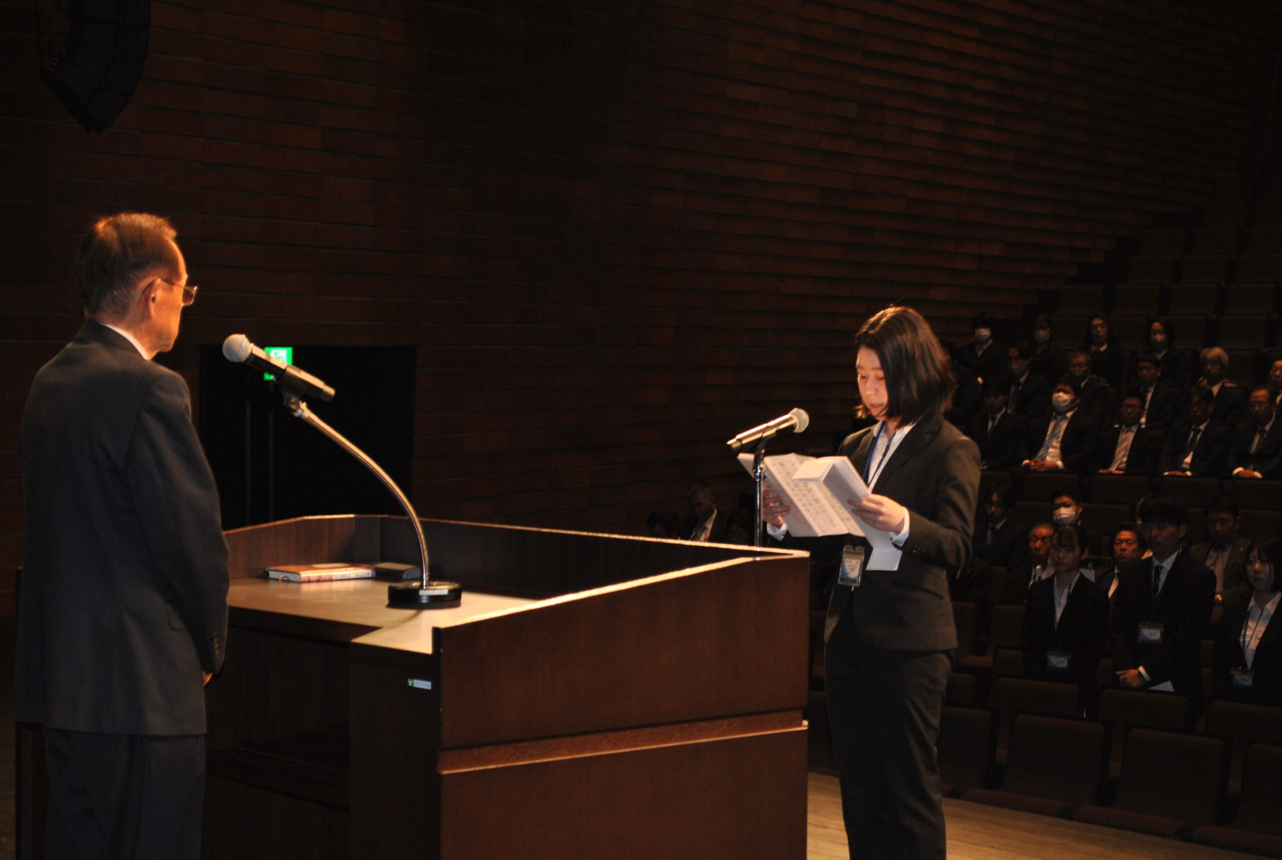辞令交付・先輩社員歓迎の言葉・新入社員誓いの言葉・に引き続き、例年のごとく私は司馬遼太郎が我々に残したメッセージ《21世紀に生きる君たちへ》を朗読する。このメッセージはもちろん新入社員に送る言葉であるが、同時に全社員にも改めて人としての生き方をわかりやすく伝える目的でもある。私自身も毎回心が洗われる思いである。