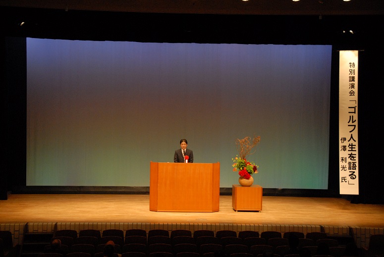 過去二度の賞金王に輝き、世界四大トーナメント(全米オープン・マスターズ・全英オープン・全米プロ)に20回以上出場し、その中でもゴルファーなら誰でも憧れるマスターズにおいて、日本人として最高位(4位)に入るなど、素晴らしい戦績を誇る伊澤利光氏を姫路市文化センターに迎え、志澤塾の新春を飾るに相応しい講演会を、去る1月14日に開催した。